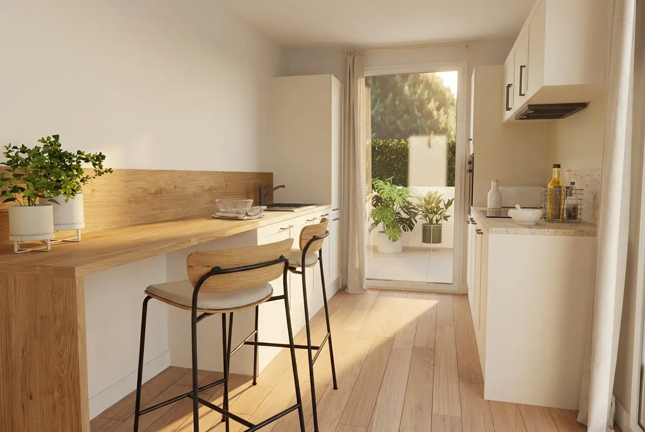 Le séjour et la salle à manger s’ouvrent sur une terrasse et un jardin privatif, parfaits pour profiter de l’extérieur.